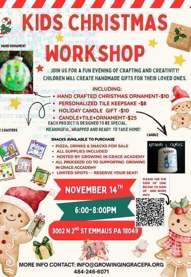 This community-focused holiday workshop offers children a fun way to learn, create, and celebrate the season while supporting the mission of Growing in Grace Academy.