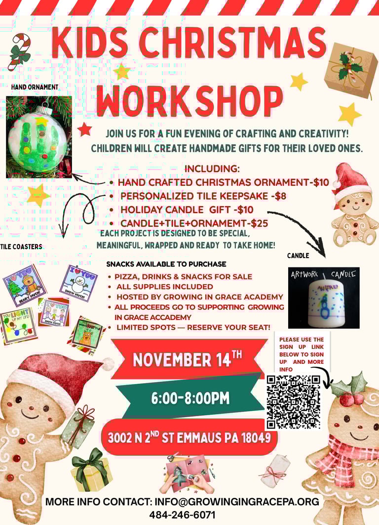 Families are invited to enjoy a festive evening of creativity at the Kids Christmas Workshop hosted by Growing in Grace Academy in Emmaus. Children will have the opportunity to create meaningful, handmade gifts just in time for the holiday season. Each craft is designed to be special, memorable, and ready to take home and give to loved ones.